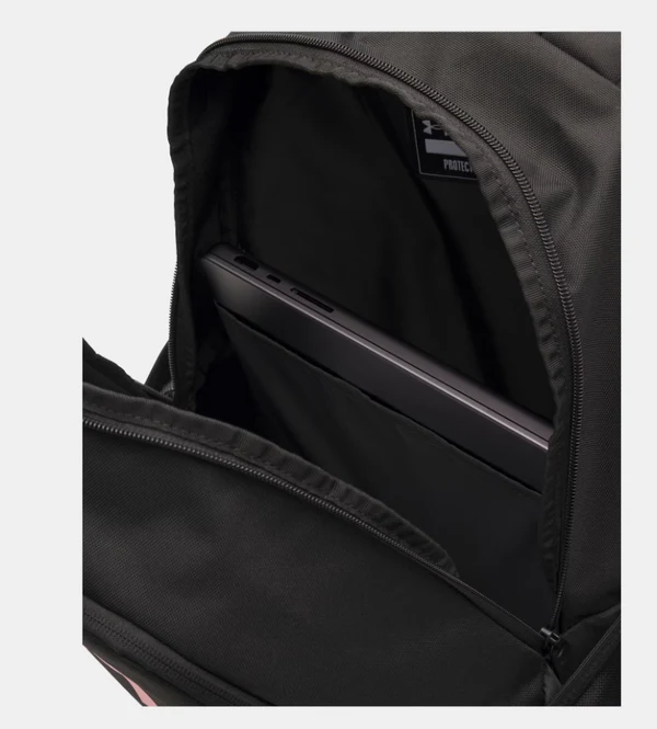 Water-resistant UA Storm technology keeps your essentials dry Soft-lined laptop sleeveholds up to 15" MacBook Pro or similarly sized laptop 2 side water bottle pockets Durable PU-coated bottom panel Style #: 6000399 Dimensions When Full: 6.7"H x 18.5"W x 12.2"D Volume: 26.5 L 100% Polyester Imported
