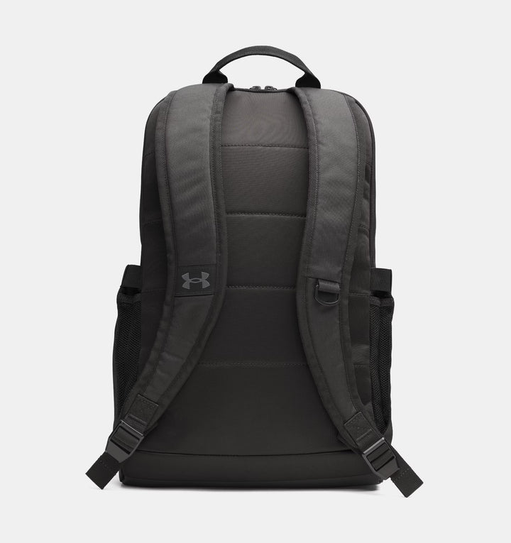 Water-resistant UA Storm technology keeps your essentials dry Soft-lined laptop sleeveholds up to 16" MacBook Pro or similarly sized laptop Adjustable, ergonomically shaped straps for more comfortable carry Front zippered pockets for extra storage 2 side water bottle pockets Ribbed nylon molle webbing on front & D-ring on strap for easy attachment Top grab handle Style #: 6000518 Dimensions When Full: Volume: 100% Polyester Imported